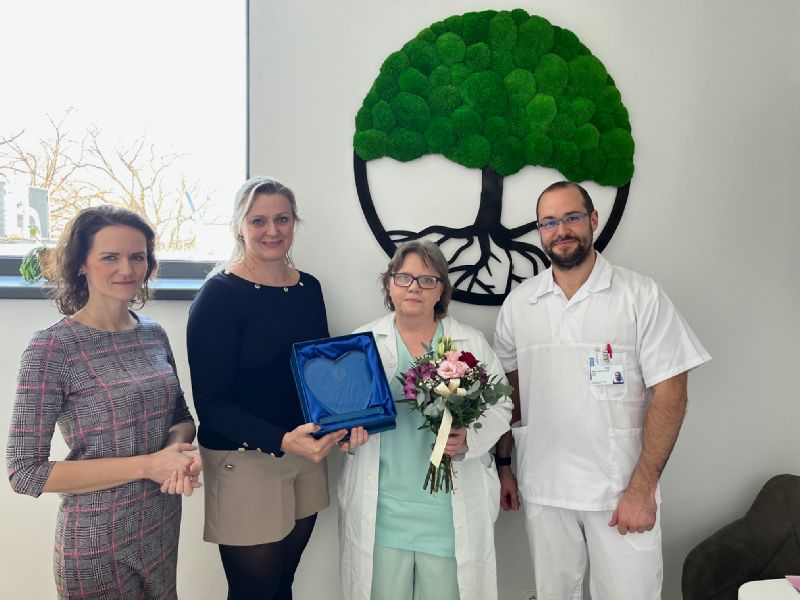 Ocenění Srdce NADACE AGEL předala členka správní rady nadace Lucie Dvořáková a gratulace a poděkování nechyběly ani ze strany vedení nemocnice. Květinu a dar předal ředitel nemocnice MUDr. Kazimír Kovář a místopředsedkyně představenstva AGEL Středomoravská nemocniční Ing. Katarina Bučková, MBA.